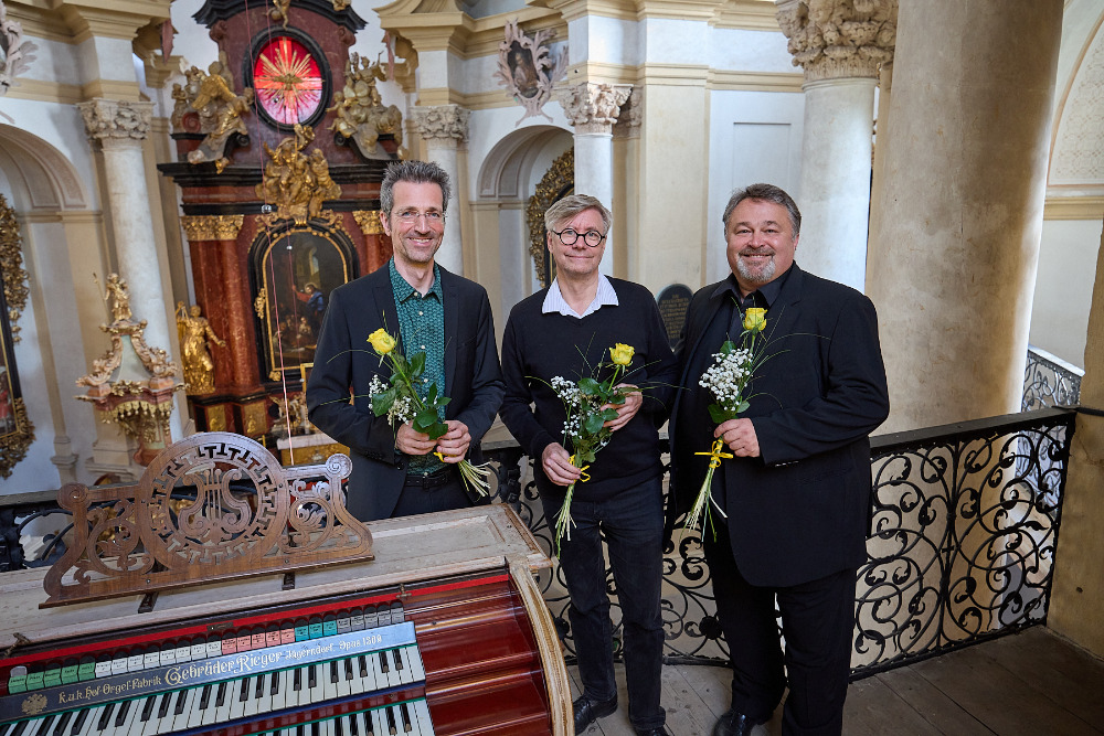 tenorista Jörg Schneider, varhaník Wolfgang Kogert a skladatel Kurt Estermann na festivalu Hudební léto Kuks